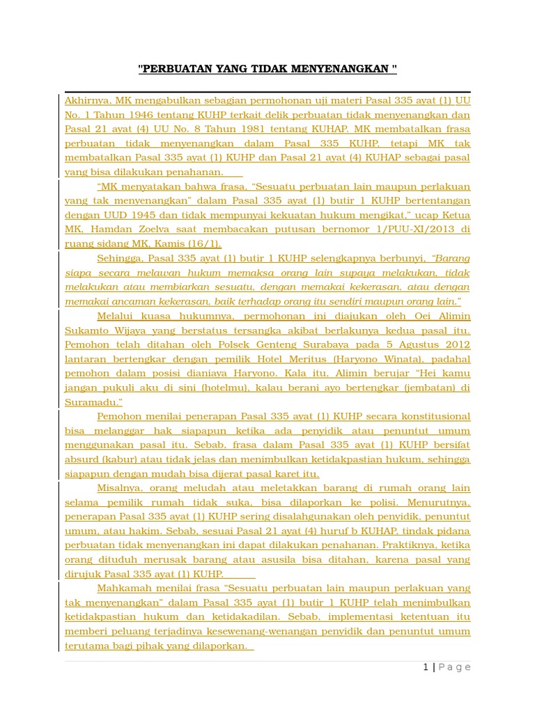 Hukum Yang Lain Perbuatan Tidak Menyenangkan Pasal 335 Ayat 1 Ke 1 Kuhp