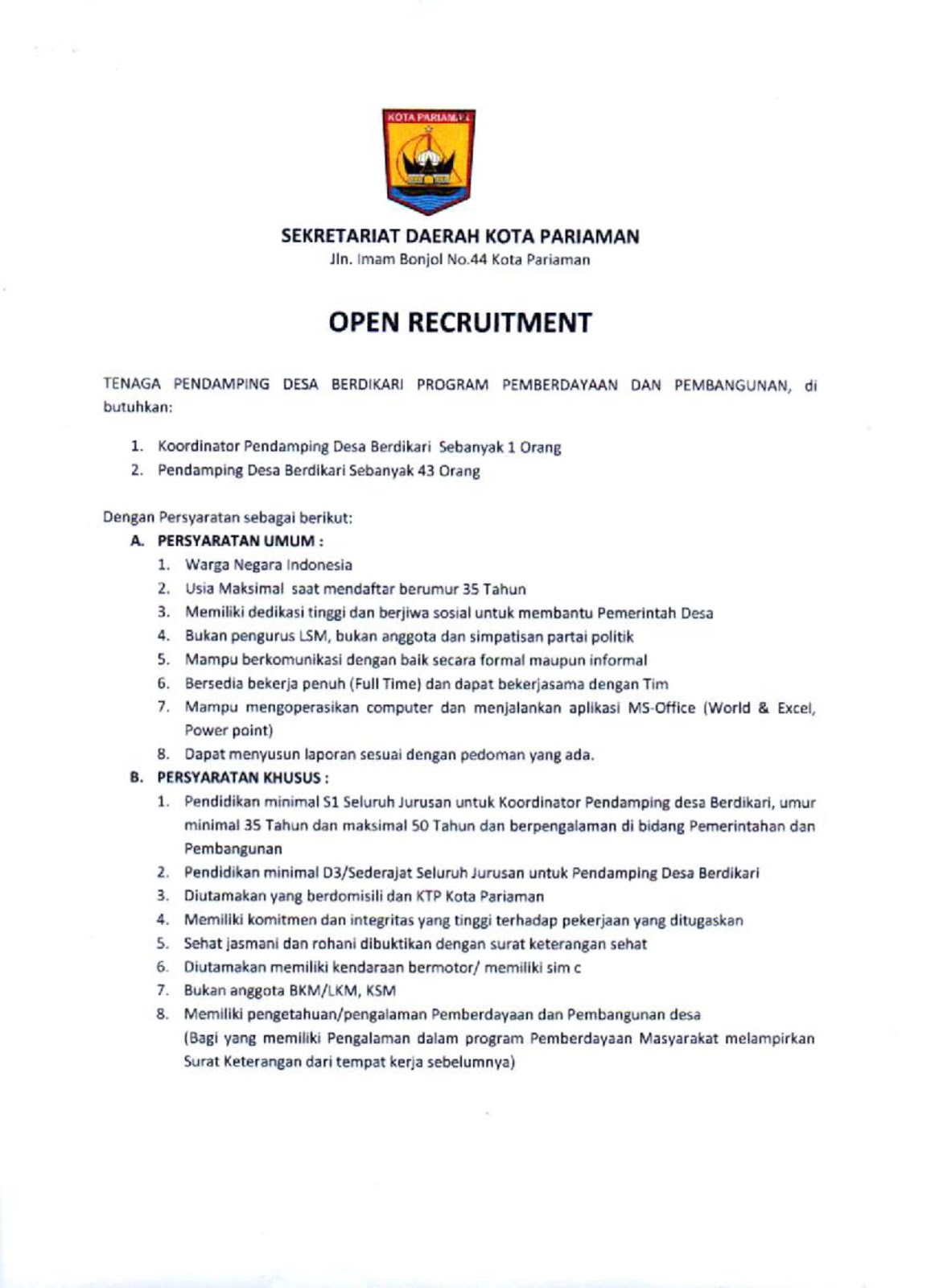 Penerimaan Non Pns Dinas Pemberdayaan Masyarakat Dan Desa Dmpd Kota Pariaman Kementerian Pdtt Tingkat D3 S1 Semua Jurusan Bulan Maret 2020 Rekrutmen Lowongan Kerja Cpns Bumn Bulan November 2021