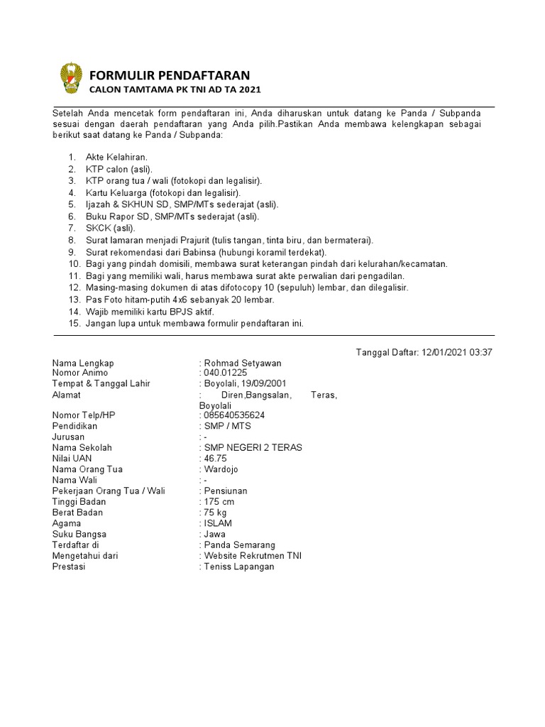 Persyaratan Pendaftaran Masuk Tni Ad 2021 2022 Pendaftaran Mahasiswa