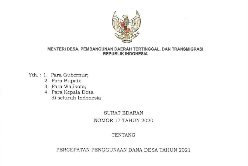 Surat Edaran Mendes Pdtt Tentang Percepatan Penggunaan Dana Desa 2021 Pemerintah Desa Bantal