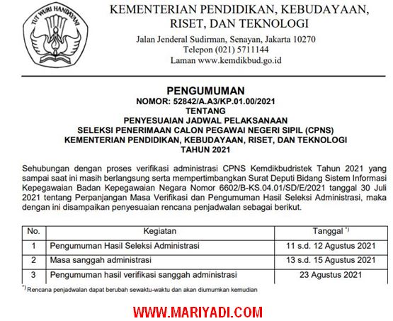 Pengumuman Hasil Seleksi Administrasi Cpns Kemendikbud 2021