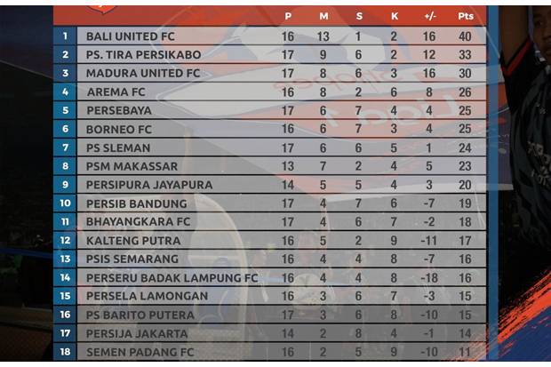 Klasemen Liga 1 Miliki Poin Sama Persija Di Atas Persib Dan Arema Fc Ungguli Persebaya Bolasport Com