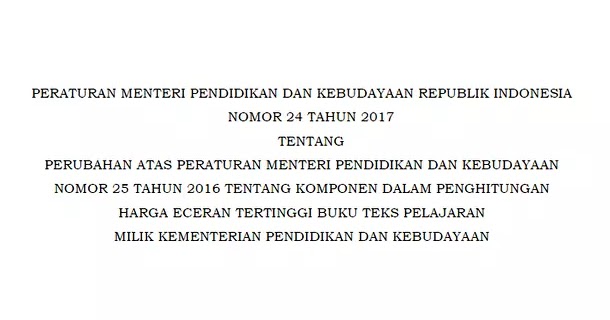 Permendikbud Nomor 24 Tahun 2017 Tentang Perubahan Atas Peraturan Menteri Pendidikan Dan Kebudayaan Nomor 25 Tahun 2016 Tentang Komponen Dalam Penghitungan Harga Eceran Tertinggi Buku Teks Pelajaran Milik Kementerian Pendidikan
