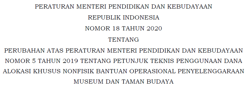 Permendikbud Nomor 18 Tahun 2020 Tentang Perubahan Atas Permendikbud No 5 Tahun 2019 Tentang Juknis Penggunaan Dak Nonfisik Bantuan Operasional Penyelenggaraan Museum Dan Taman Budaya Dadang Jsn
