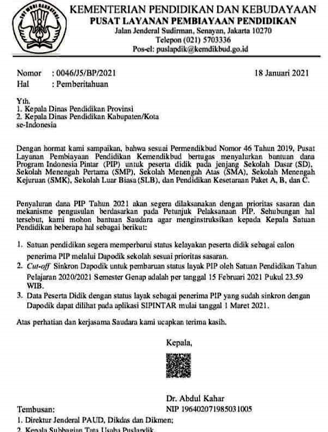 Surat Edaran Tentang Cut Off Dapodik Usulan Pip Tahun 2021 Resmi Kemendikbud
