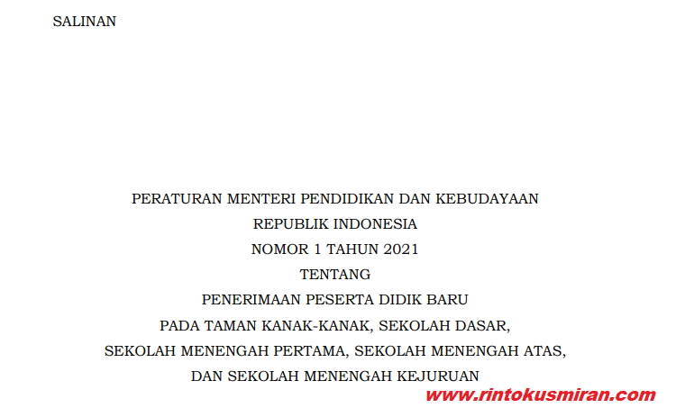 Rinto Kusmiran Permendikbud Nomor 1 Tahun 2021 Tentang Juknis Penerimaan Peserta Didik Baru Ppdb Tahun Pelajaran 2021 2022 Jenjang Tk Sd Smp Sma Dan Smk