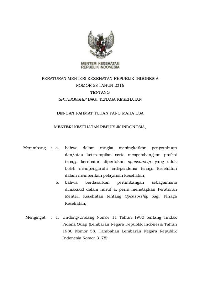 Permenkes Ri Nomor 58 Tahun 2016 Tentang Sponsorship Bagi Tenaga Kesehatan Gakeslab Indonesiagakeslab Indonesia