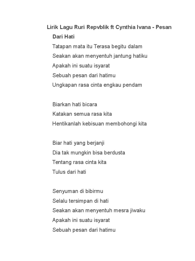 Lirik Lagu Pesan Dari Hati Ruri Repvblik Ft Cynthia Ivana