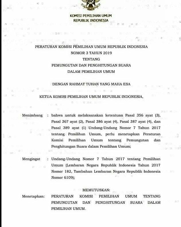 Pkpu No 3 Tahun 2019 Tentang Pemungutan Dan Penghitungan Suara Dalam Pemilihan Umum