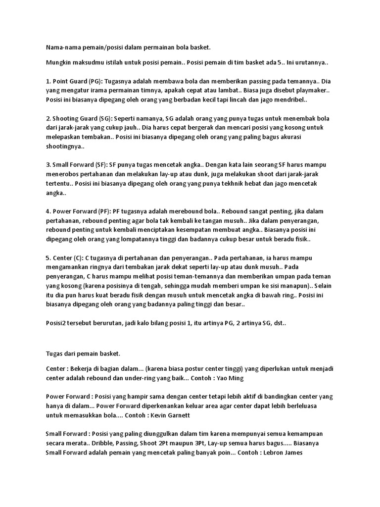 Posisi Pemain Bola Basket Dan Tugasnya Gurumapel