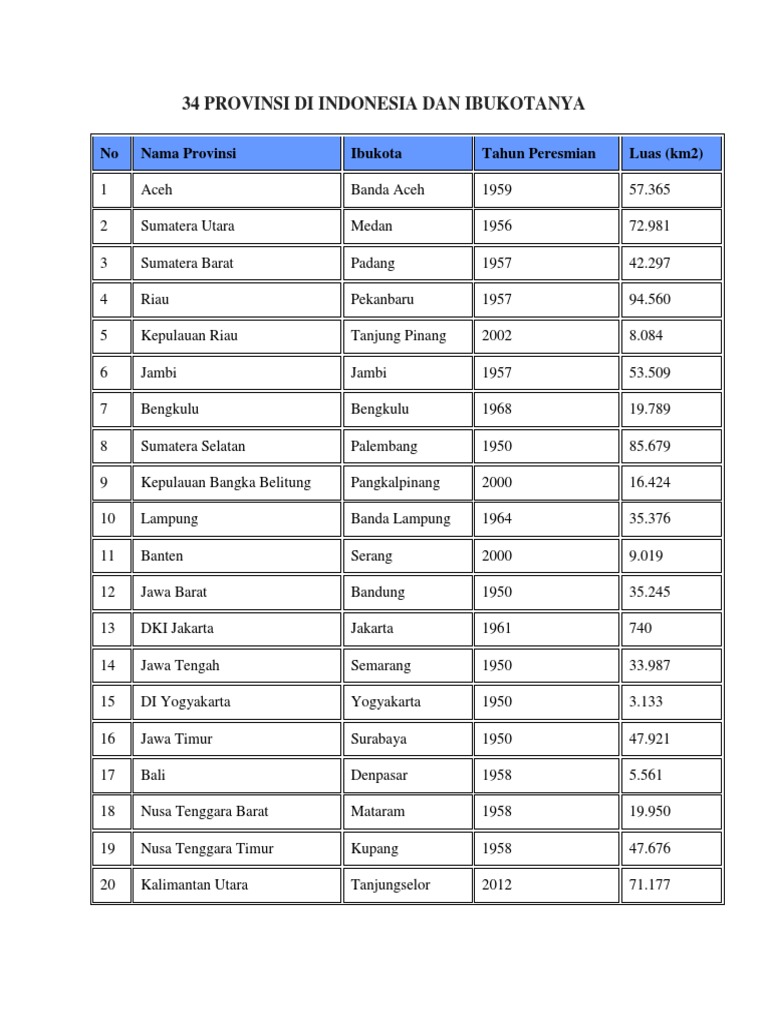 Tabel 34 Provinsi Di Indonesia Dan Ibukotanya Pdf