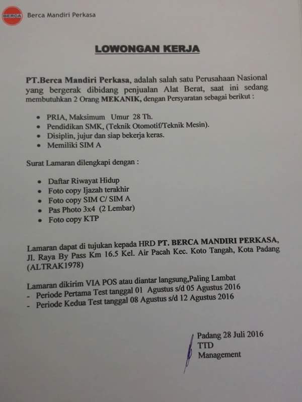 Lowongan Kerja Pt Berca Mandiri Perkasa Agustus 2016 Info Lowogan Baru