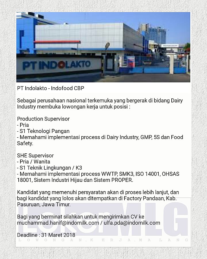 L O K E R M A L A N G Media A Twitter Lokermlg Pt Indolakto Indofood Cbp Membuka Lowongan Kerja Untuk Posisi Production Supervisor She Supervisor Bagi