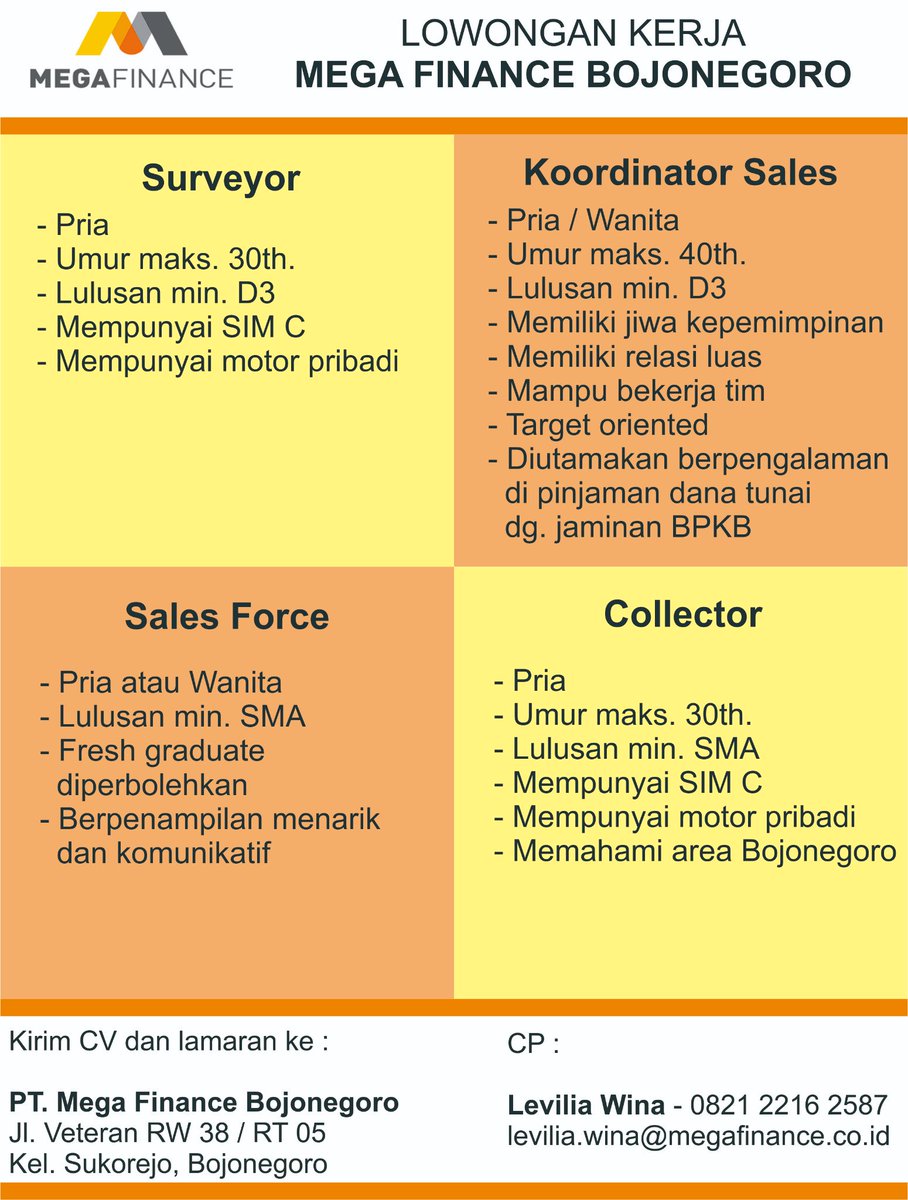 Bojonegorokarir On Twitter Open Recruitment Pt Mega Finance Bojonegoro Untuk Persyaratan Dilampirkan Fotocopy Ak 1 Kartu Kuning Dari Disnaker Https T Co Yevyb7q6ub