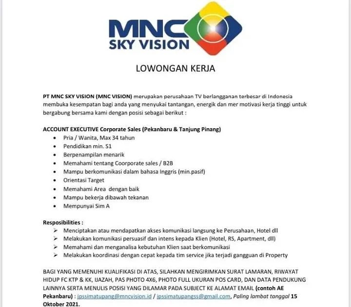Lowongan Pt Mnc Sky Vision Mnc Vision Pekanbaru Oktober 2021