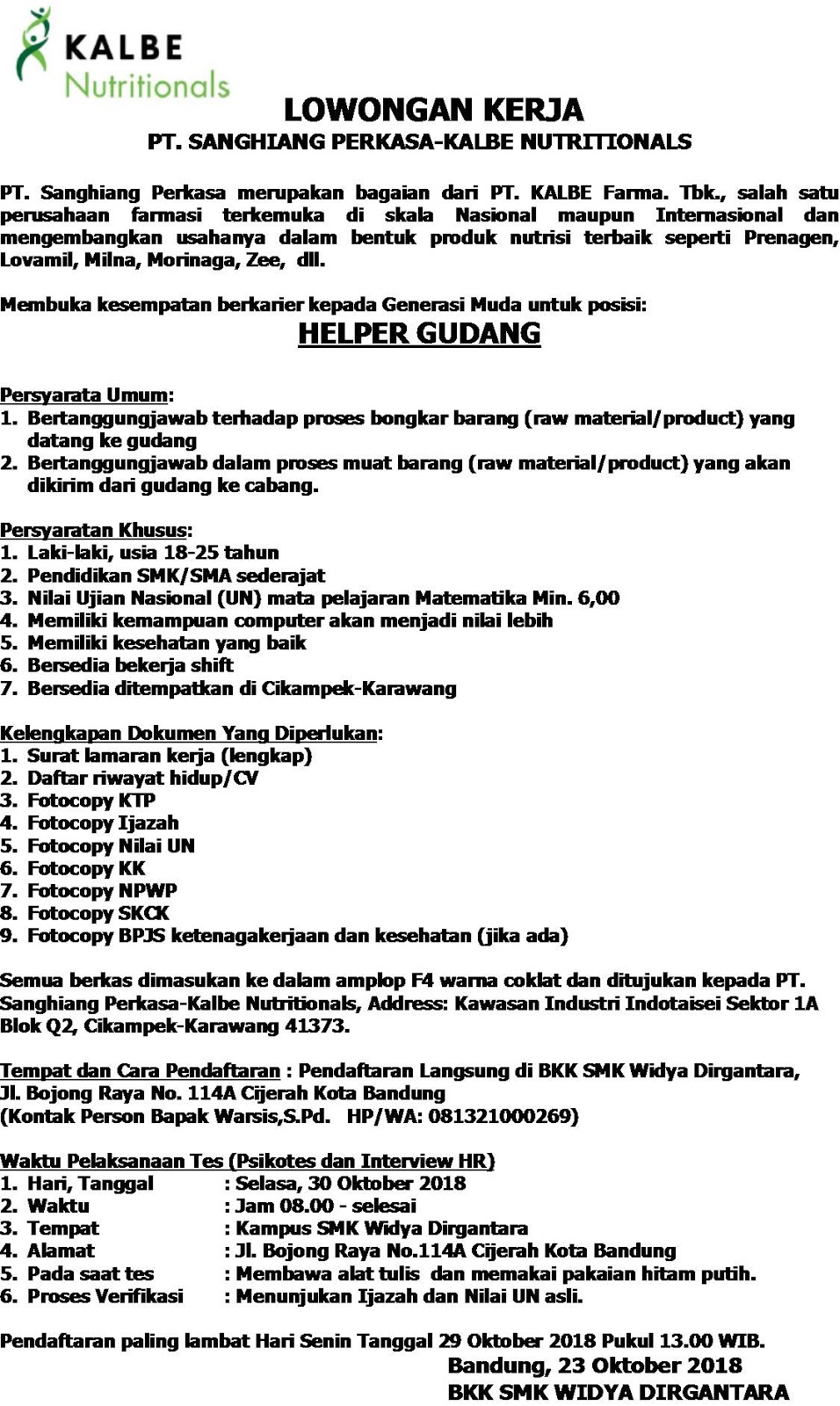 Loker Pt Sanghiang Perkasa Kalbe Nutritionals Bkk Dan Hubin Smk Widya Dirgantara Bandung
