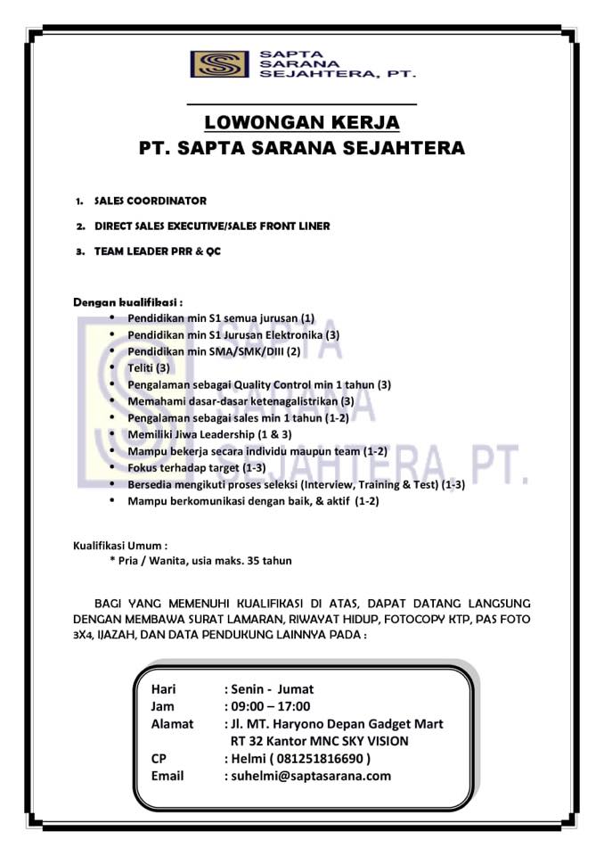 Lowongan Pekerjaan Pt Sapta Sarana Sejahtera