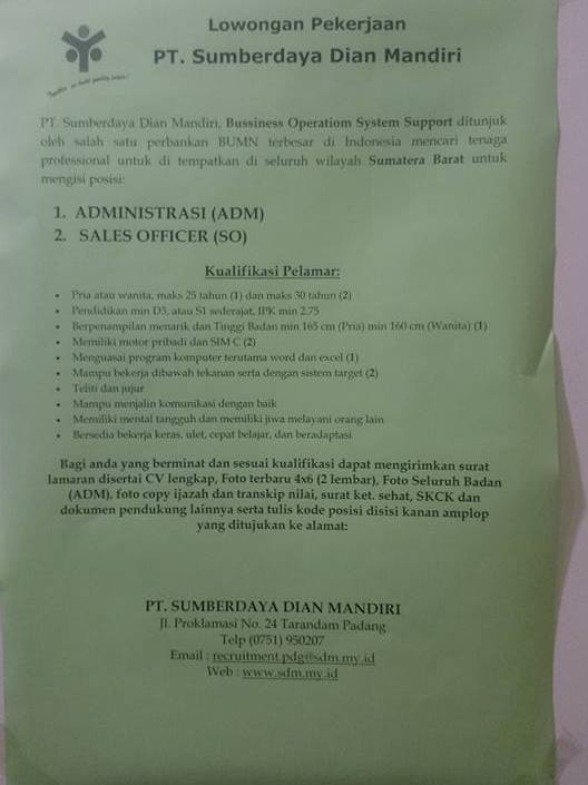 Lowongan Kerja Padang Pt Sumberdaya Dian Mandiri 2 Posis Februari 2017 Smith Jokerman