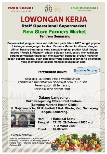Jakarta Loker Pt Supra Boga Lestari Farmers Market Ranch Market Kembangan Jakarta Barat Membutuhkan 1 Kasir 2 Staff Operasional Kualifikasi Pria Wanita Usia Maksimal 27 Tahun Belum Menikah Single Pendidikan Minimal