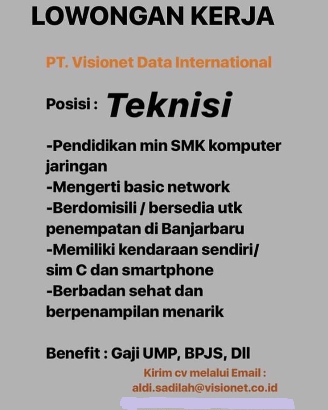 Galeri Kerja Karir Plus Lowongan Kerja Teknisi Pt Visionet Data International Penempatan Banjarbaru