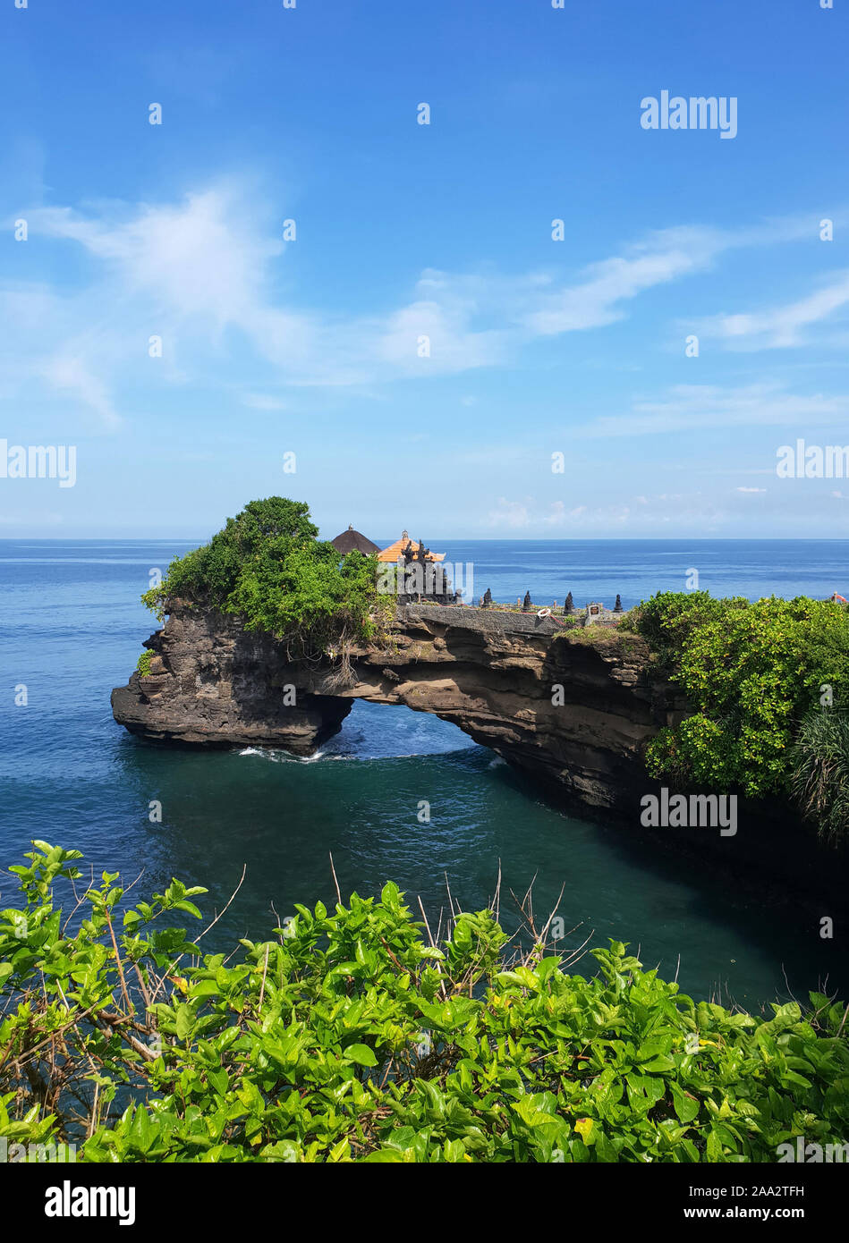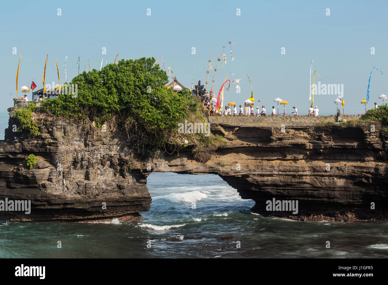 Stunning Natural Rock Arch At Pura Batu Bolong In Tanah Lot Temple Area With Pilgrims In Ceremonial Dress Passing Over The Hole In The Rock In Bali Stock Photo Alamy