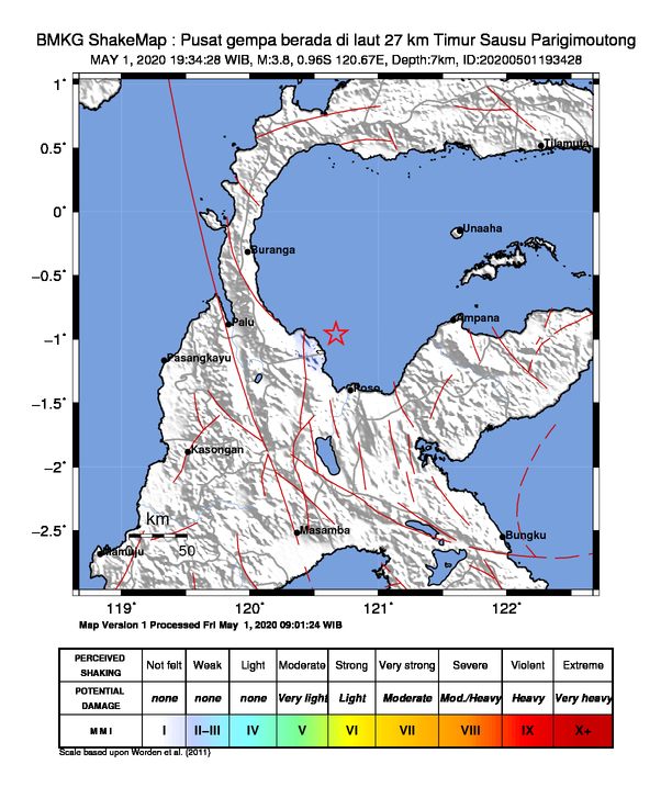 Bmkg On Twitter Gempa Mag 3 8 01 Mei 20 19 34 28 Wib Lok 0 96 Ls 120 67 Bt Pusat Gempa Berada Di Laut 27 Km Timur Sausu Parigimoutong Kedlmn 7 Km Dirasakan Mmi Ii Poso Bmkg Https T Co St0lcemhd3