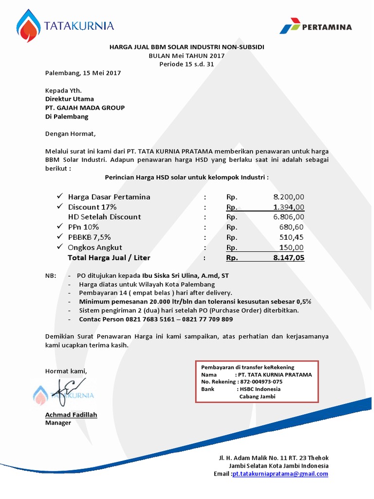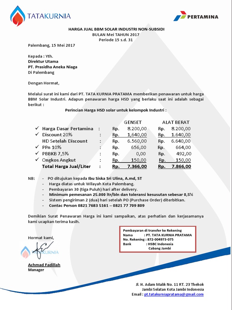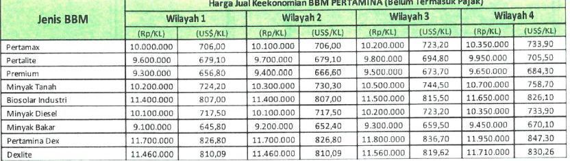 Pricelist Bbm Dan Solar Industri Pertamina Tri Karya Wiguna