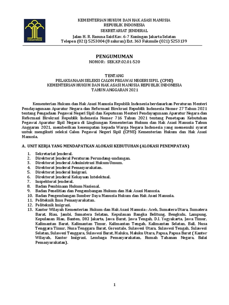 Pengumuman Formasi Cpns Kemenkumham 2021