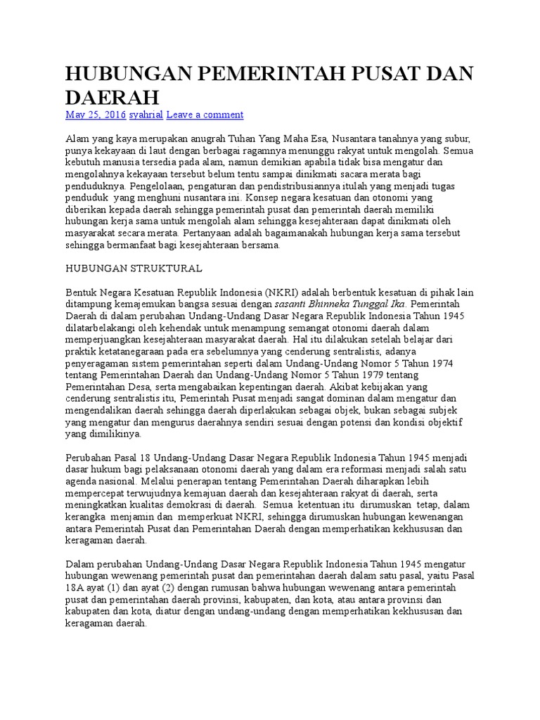 Hubungan Pemerintah Pusat Dan Pemerintah Daerah
