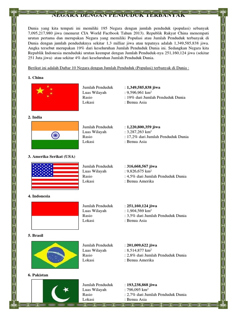 10 Negara Dengan Jumlah Penduduk Populasi Terbanyak Di Dunia