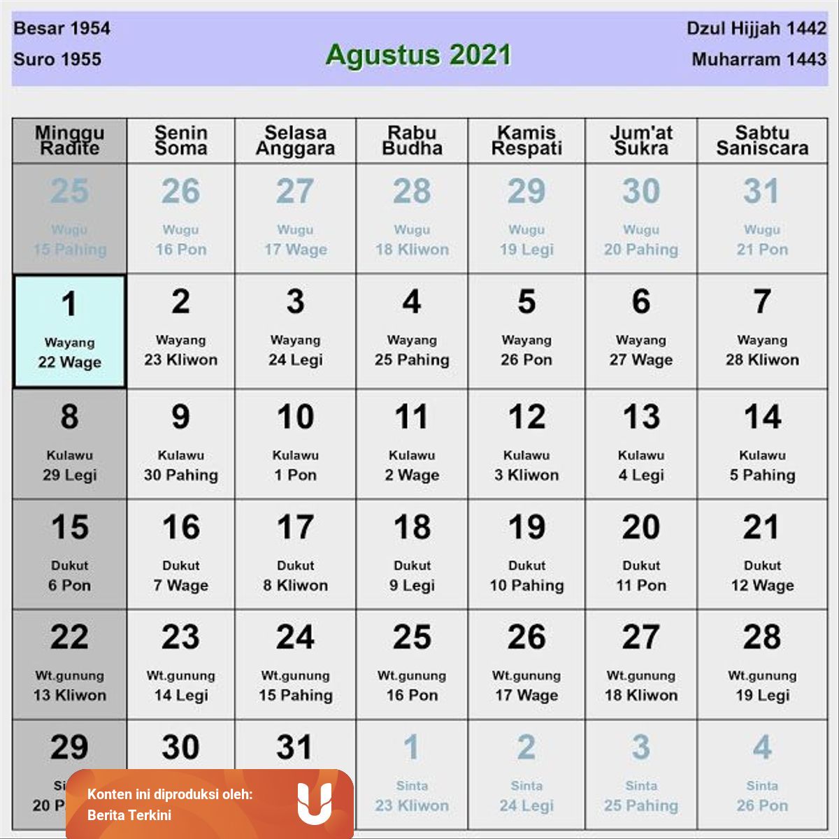 Kalender Jawa Bulan Agustus 2021 Masehi Lengkap Kanalmu