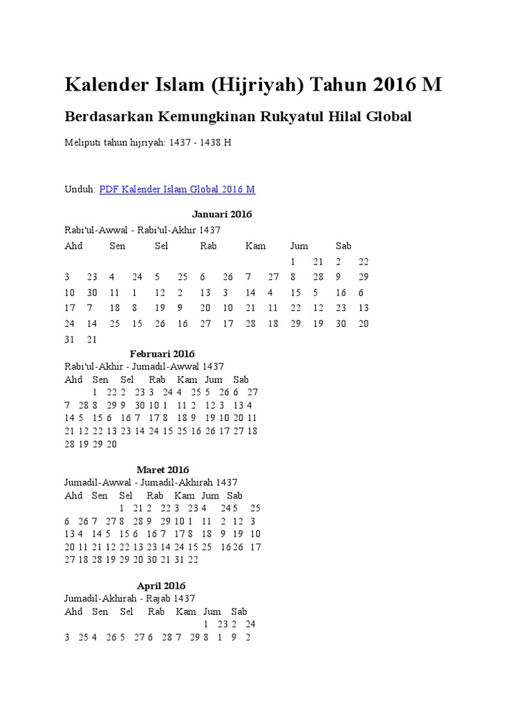 Kalender Islam Hijriyah Tahun 2016 M Kalender Islam Hijriyah Tahun 2016 M Berdasarkan Kemungkinan