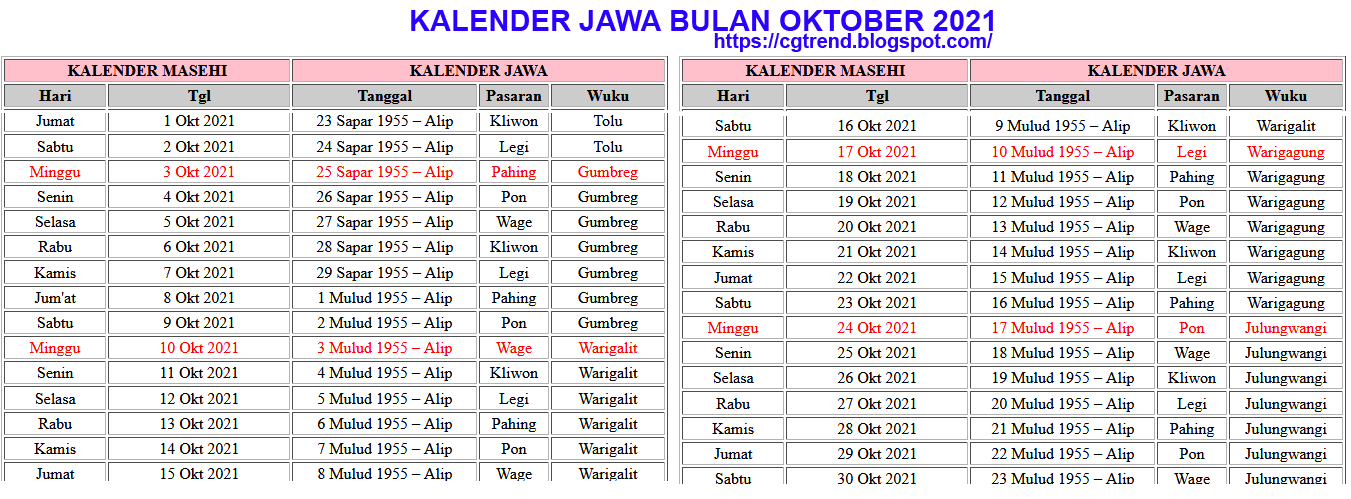Kalender Jawa Bulan Oktober 2021 Lengkap Weton