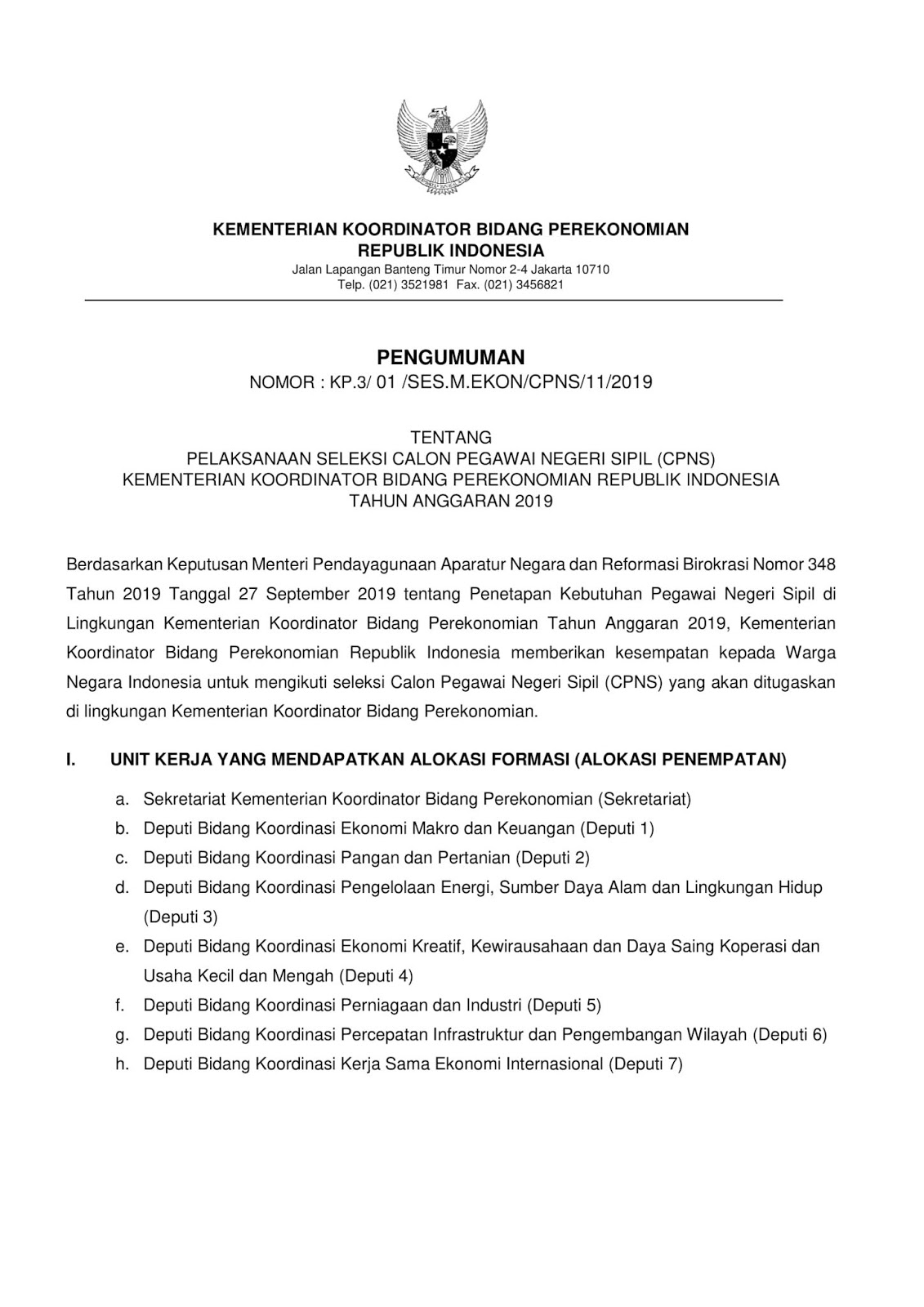 Pengumuman Seleksi Cpns Kementerian Koordinator Bidang Perekonomian