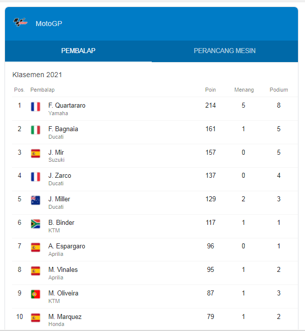 Klasemen Motogp 2021 Hari Ini Lengkap Tim Dan Konstruktor Usai Race Portugal