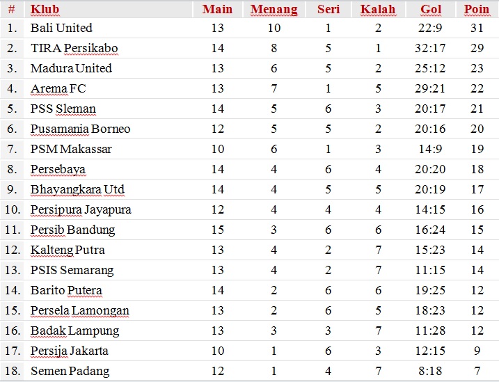 Klasemen Liga 1 2019 Bali United Juara Paruh Musim