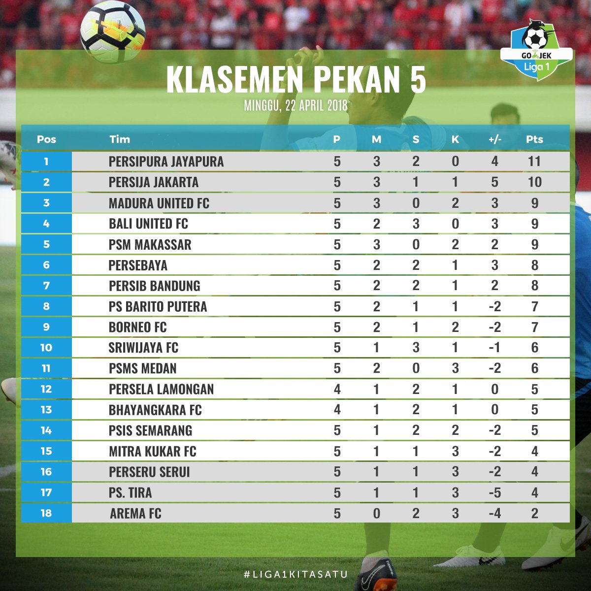 Bri Liga 1 No Twitter Klasemen Sementara Go Jek Liga 1 Pekan 5 Hingga Hari Minggu 22 4 Klasemen Selengkapnya Https T Co Cj3bpam0bp Gojekliga1 Liga1kitasatu Https T Co 0stgmogav3