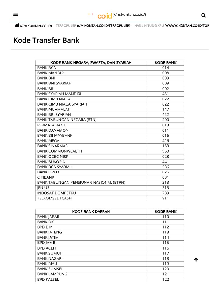 Daftar Kode Bank Transfer Bca Bni Mandiri Bri Dan 130 Lainnya