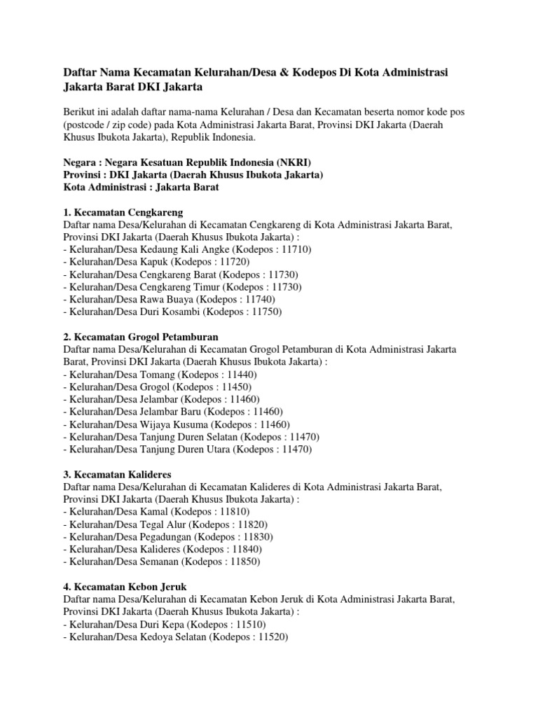 Area Pengiriman Wilayah Jakarta Kotamadya Kecamatan Kelurahan Kode Pos 1 Jakarta Barat Cengkareng Kedaung Pdf Document