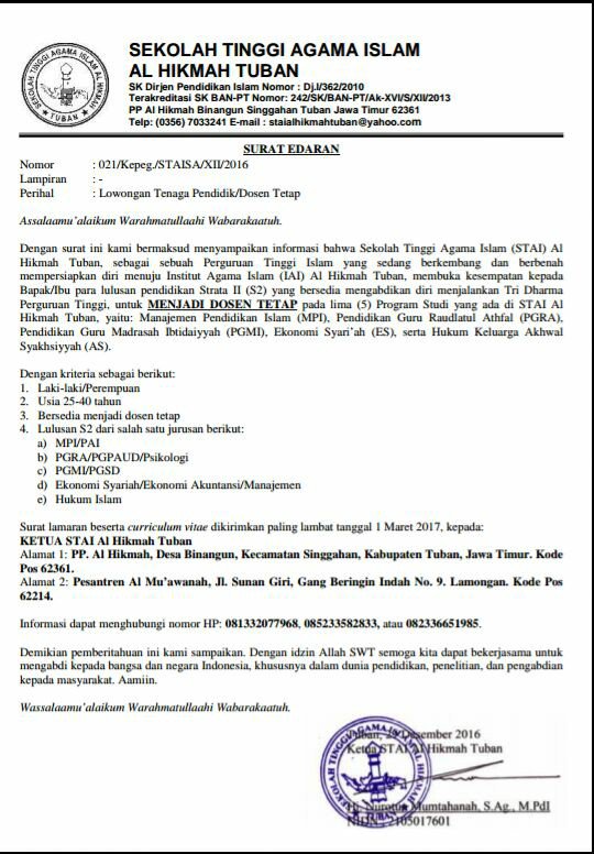 Lowongan Dosen Stai Al Hikmah Tuban 2017 Terbaru Harian Guru