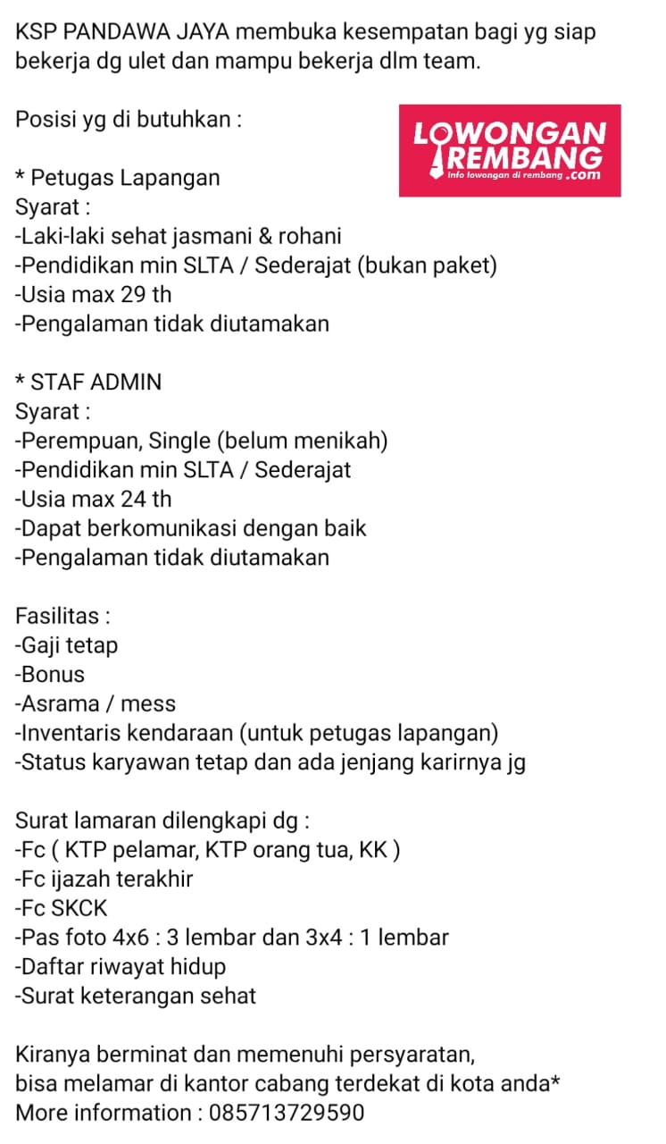 Lowongan Kerja Posisi Petugas Lapangan Dan Staff Admin Ksp Pandawa Jaya Blimbing Malang Rembang Lowongan Rembang