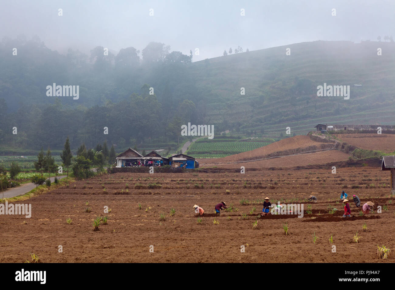 Kota Batu Malang Indonesia July 14 2018 Farmers Work Hard In Field Group Of Women Dig Up By Hands Garden On Background Of Terraced Plantation Stock Photo Alamy