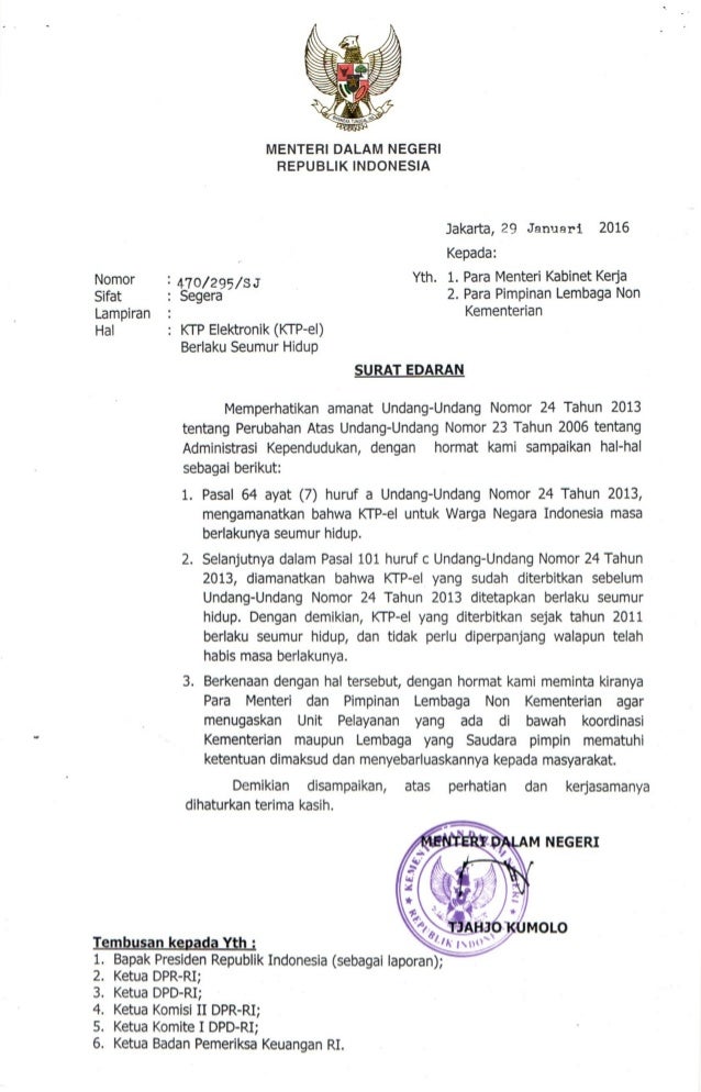 Surat Edaran Mendagri Tentang Pemberlakuan E Ktp Seumur Hidup