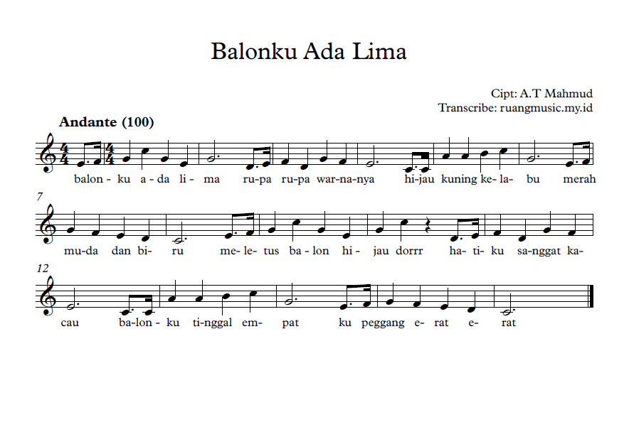 Catatan Octa Partitur Lagu Balonku Ada Lima Ciptaan At Mahmud