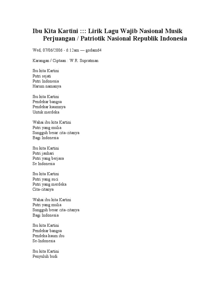 Lagu Nasional Lirik Dan Chord Lagu Ibu Kita Kartini