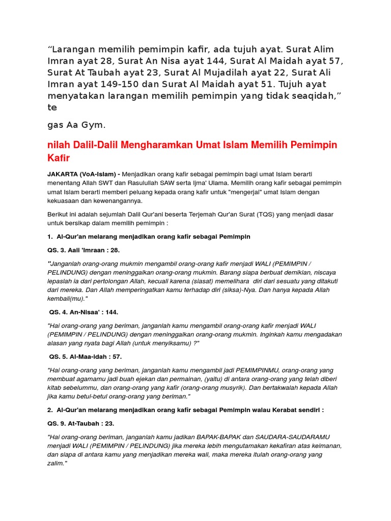 Bahaya Jadi Kafir Karena Memilih Pemimpin Kafir Voa Islam Com