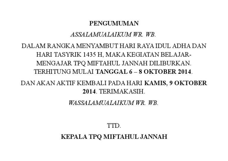 Pengumuman Libur Hari Raya Idul Adha 1440 H Sma Negeri 12 Berau