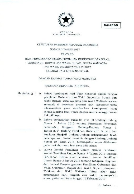 Keputusan Presiden Republik Indonesia Nomor 3 Tahun 2017 Tentang 15 Februari 2017 Sebagai Hari Libur Nasional Situs Resmi Komisi Pemilihan Umum Kota Jakarta Selatan