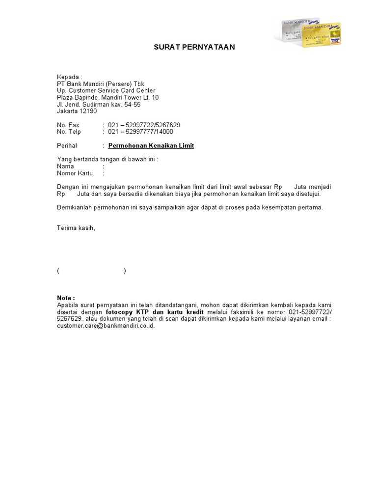 Surat Pernyataan Kenaikan Limit Kartu Kredit Bri Dengan