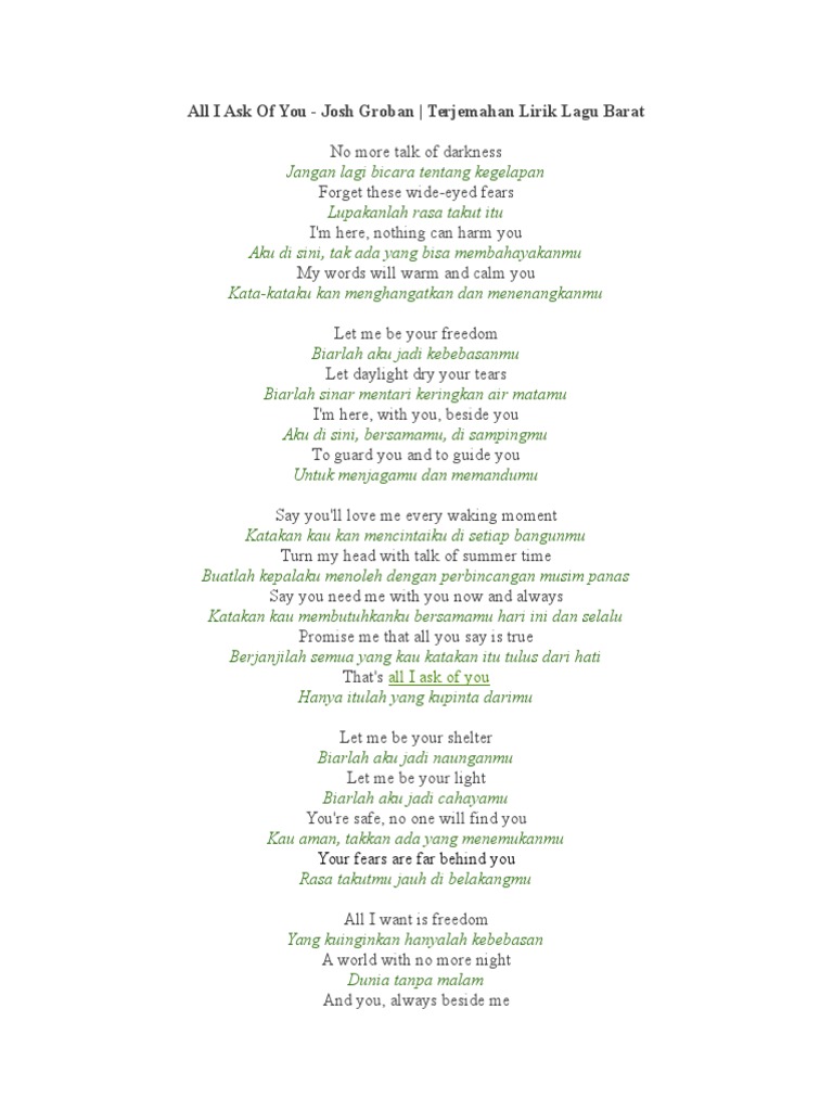 Terjemahan Lirik Lagu All I Ask Of You Josh Groban Naviri Magazine